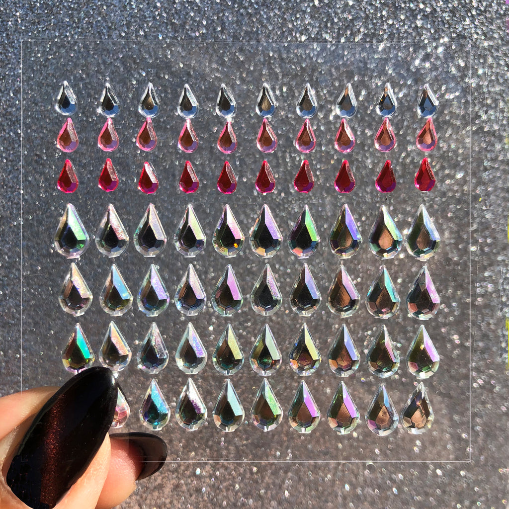 Sparkling teardrops for crybabies! Now in two sizes and in three colors for creating, limitless eye looks. 70 gems per sheet, vegan self-adhesive glue, and fierce holographic sparkle. Special holiday adornments, get them while they last!
