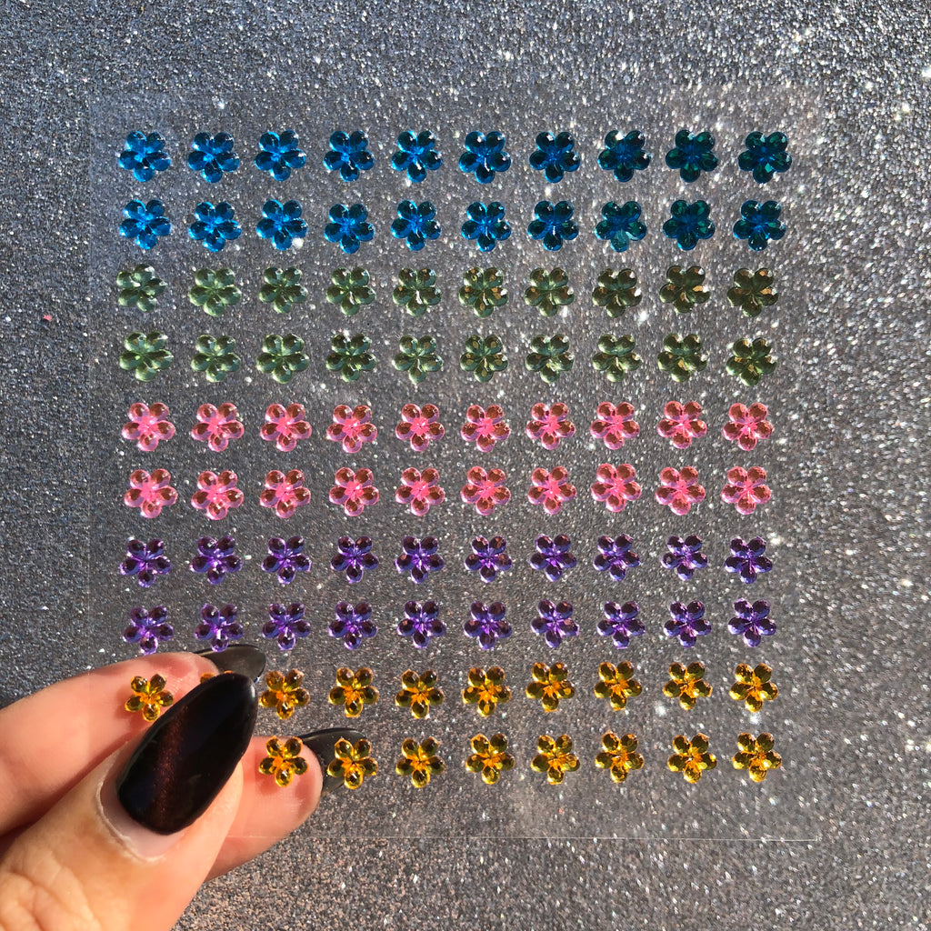 A panel of sparkly, self-adhesive flower gems in a sweet color scheme of honey yellow, soft pink, violet, green, and Cali blue. Embellish your face with flower freckles or decorate your hairline with sweet blossoms.