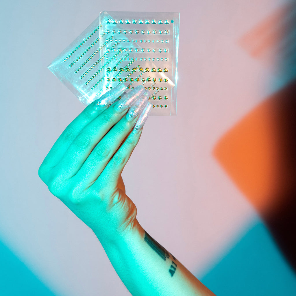 Self-adhesive, holiday star-studded hardware eyeliner and brow strips in a set of large and small-scaled arrangments create dynamic eye-looks within seconds. Each sheet includes individual heart-shaped freckles in a reflective silver and gold finish. An eco-friendly reusable beauty product.